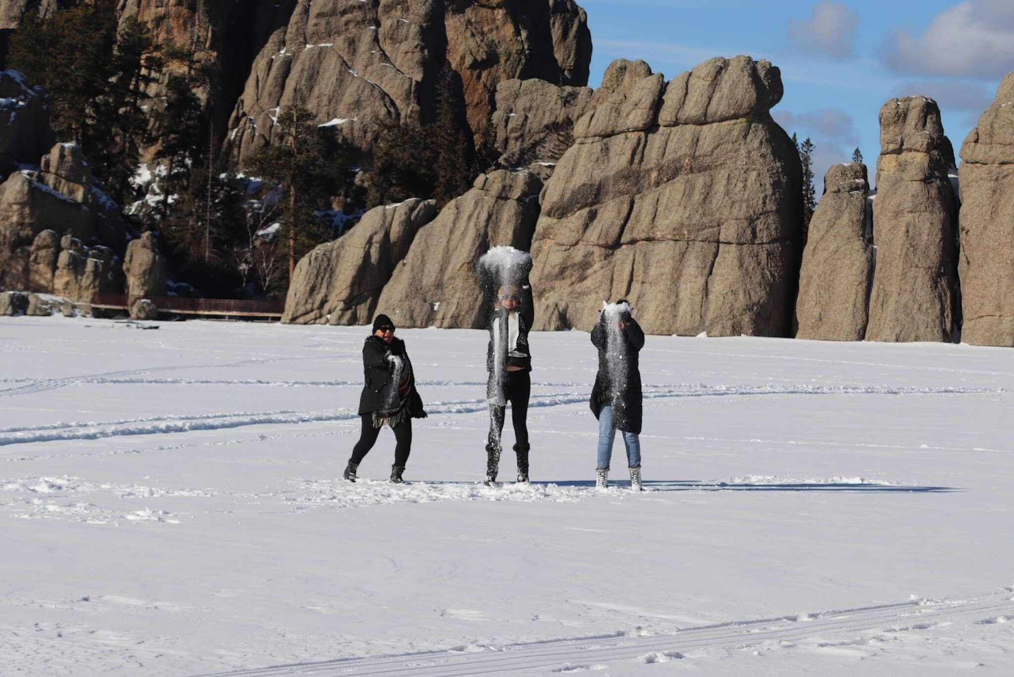 Sylvan Lake in Custer State Park is awe-inspiring. We’ll stop here to see how beautiful the still-frozen lake is, with the rocks jutting out of the water. Ice fishermen often set up directly in the middle of the lake. Then, a trail winds its way around to see the features from all angles. This is a favorite of all guests. The Black Hills Winter Wonderland Tour is awesome.